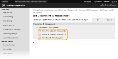 [Kimliği Bilinmeyen Baskı İşlerine İzin Ver (Allow Print Jobs with Unknown IDs)]/[Bilinmeyen Kimlikli Tarama İşlerine İzin Ver (Allow Scan Jobs with Unknown IDs)]/[S/B Kopya İşlerine İzin Ver (Allow Black & White Copy Jobs)] onay kutuları hakkında bilgi için bkz.