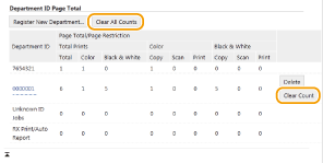 Sayıları sıfırlamak istiyorsanız, [<Department ID> (<Department ID>)] altındaki ilgili metin bağlantısına tıklatın ve ardından [Sayımı Sil (Clear Count)]  [Tamam (OK)] seçeneklerine tıklatın. Tüm Departman Kimliklerinin sayılarını sıfırlamak istiyorsanız, [Tüm Sayımları Temizle (Clear All Counts)]  [Tamam (OK)] seçeneğine tıklatın.