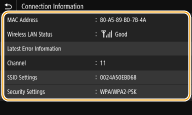 <Kablosuz LAN Durumu (Wireless LAN Status)> ve <En Son Hata Bilgisi (Latest Error Information)> öğeleri <Durum Denetleme (Status Monitor)> ekranından görüntülenebilir.