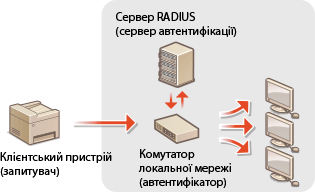IEEE 802.1X – це стандарт і механізм блокування неавторизованого доступу до мережі шляхом колективного керування інформацією про автентифікацію користувачів. Якщо пристрій намагається підключитися до мережі 802.1X, пристрій має пройти автентифікацію користувача, щоб довести, що підключення створено авторизованим користувачем. Інформація про автентифікацію надсилається до сервера RADIUS, який її перевіряє та дозволяє зв’язок із мережею або відхиляє його залежно від результату автентифікації. Якщо автентифікація не вдається, перемикач бездротової локальної мережі (або точка доступу) блокує доступ зовні мережі. Апарат може підключитися до мережі 802.1X як клієнтський пристрій.