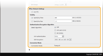 Chỉ định các cài đặt [Valid for] và [Authentication]/[Encryption]/[DH Group].