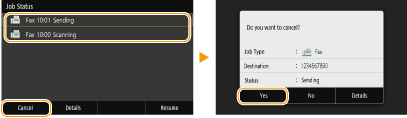 Nếu bạn muốn huỷ gửi fax ngay lập tức sau khi chọn <Bắt Đầu (Start)>, hãy chọn <Hủy (Cancel)> trên màn hình hoặc nhấn trên bảng thao tác. Bạn cũng có thể huỷ gửi fax sau khi kiểm tra tình trạng fax.