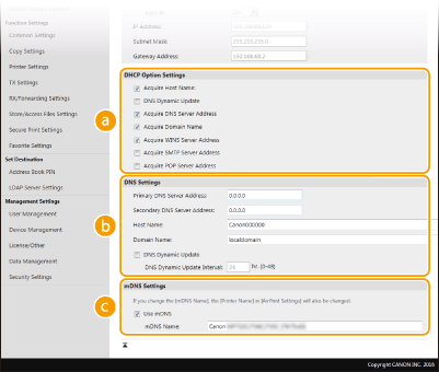 Chọn hộp kiểm để cập nhật động hồ sơ DNS bất cứ khi nào địa chỉ IP của máy bị thay đổi. Khi chỉ định khoảng thời gian giữa những lần cập nhật, nhập thời gian với đơn vị giờ vào hộp văn bản [DNS Dynamic Update Interval]. [mDNS Settings][Use mDNS]