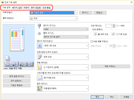 인쇄 화면에서 사용 중인 디바이스를 선택 → [기본 설정], [프린터 속성] 또는 [속성]을 클릭합니다.