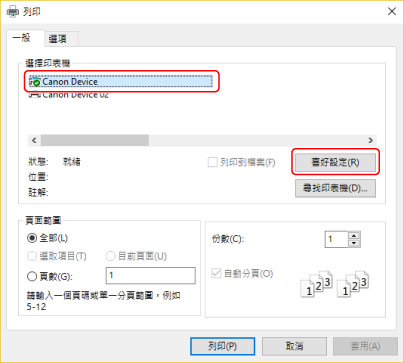 在列印畫面中,選取您所使用的裝置 → 按一下 [喜好設定]、[印表機內容] 或 [內容]。