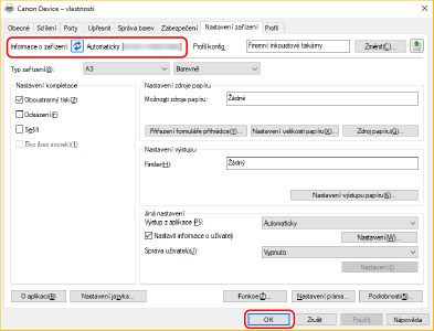 Potvrďte, že [Informace o zařízení] jsou nastaveny na [Automaticky] → klikněte na [OK].