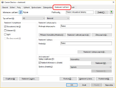 Obvykle jsou během instalace získány informace o zařízení a informace o funkcích a doplňcích zařízení se nastaví automaticky. Podle následujícího postupu zkontrolujte, zda jsou [Informace o zařízení] nastaveny na možnost [Automaticky].