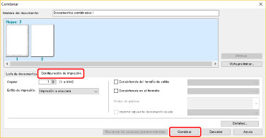 Si desea cambiar la configuración de impresión, haga clic en la hoja [Configuración de impresión] → configure los elementos necesarios → haga clic en [Combinar].