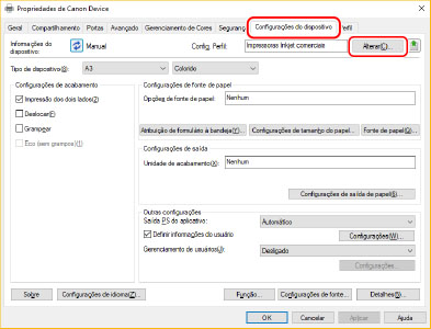 Exiba a guia [Configurações do dispositivo] → clique em [Alterar].