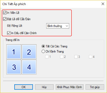 Hộp thoại [Chi Tiết Áp phích]: [In Viền Lề], [Đặt Lề để Cắt/Dán], và [In Dấu để Căn Chỉnh]