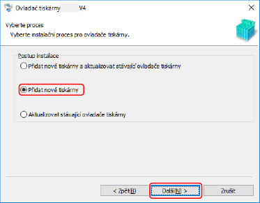 [Aktualizovat stávající ovladače tiskárny]: Tuto možnost vyberte, pokud chcete pouze aktualizovat ovladače. Podrobné informace najdete v postupu pro aktualizaci ovladačů.
