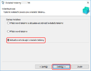 Vyberte možnost [Aktualizovat stávající ovladače tiskárny] → klikněte na tlačítko [Další].