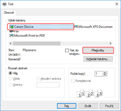 Na obrazovce tisku vyberte zařízení, které používáte → klikněte na tlačítko [Předvolby], [Vlastnosti tiskárny] nebo [Vlastnosti].