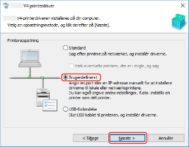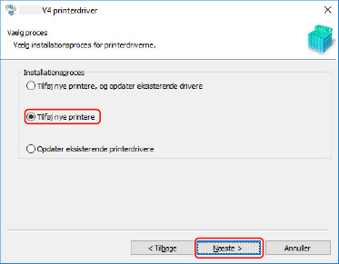 [Opdater eksisterende printerdrivere]: Vælg denne, hvis du kun vil opdatere drivere. For flere oplysninger henvises der til proceduren for opdatering af drivere.