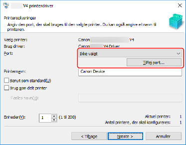 Angiv en WSD-port, standardmæssig TCP/IP-port, netværksprinterport eller lokal port. Du kan vælge en midlertidig port ([LPT1] etc.) og indstille den, når installationen er udført.