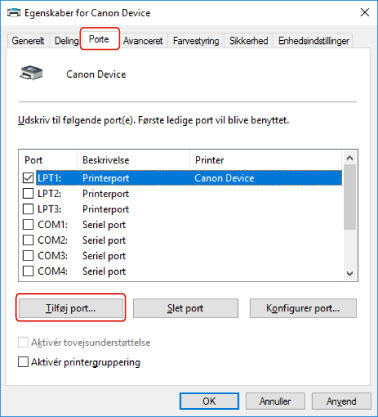 Hvis du midlertidigt indstiller en port for enheden, når du installerer driveren, skal du ændre den til en korrekt port ved at følge denne procedure.