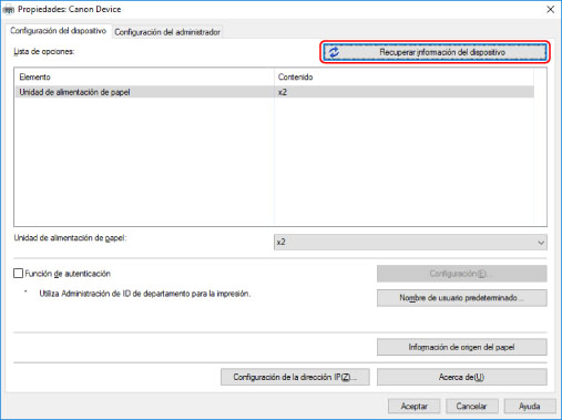 Cuando se efectúa la instalación mediante una conexión de red, normalmente la información sobre las opciones instaladas en el dispositivo se recupera y se configuran las funciones asociadas al controlador para que puedan utilizarse. Cuando las funciones del dispositivo no se puedan utilizar, o cuando se agregue una opción, se debe volver a adquirir la información del dispositivo y configurar la estructura de opciones de forma manual.