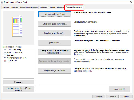 Si se muestra la pantalla de ajustes de impresión estándar de Windows, que no dispone de una hoja [Soporte/dispositivo], es posible que exista un problema con el entorno, la configuración o el estado de instalación del controlador. Consulte el apartado de solución de problemas para permitir que se visualice la pantalla de ajustes de impresión del controlador.