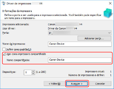 Selecione [Usar como impressora compartilhada] → altere [Nome compartilhado] se necessário → clique em [Avançar].