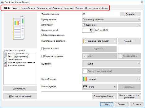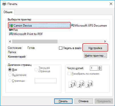 На экране печати выберите используемое устройство → нажмите [Настройка], [Свойства принтера] или [Свойства].