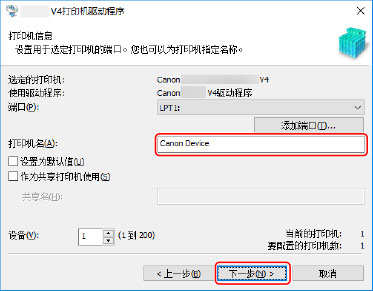 如果添加或选择了网络打印机端口,则无法设置[打印机名]和[作为共享打印机使用]。