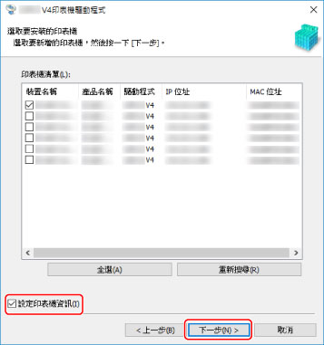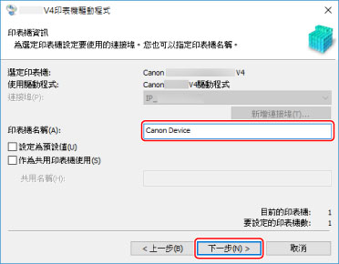 如果您要變更裝置名稱,或設定裝置為預設裝置,請選取 [設定印表機資訊] → 按一下 [下一步]。