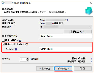 如果您選取 [標準] 並設定共用設定,請選取 [設定印表機資訊],然後按一下 [下一步]。