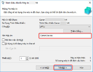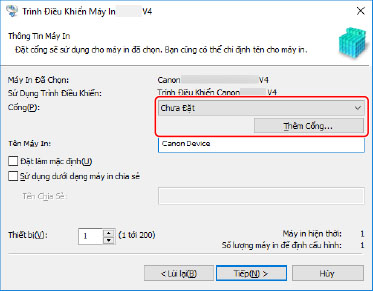 Nếu bạn đã thêm hoặc chọn cổng máy in mạng, bạn không thể cài đặt [Tên Máy In] và [Sử dụng dưới dạng máy in chia sẻ].
