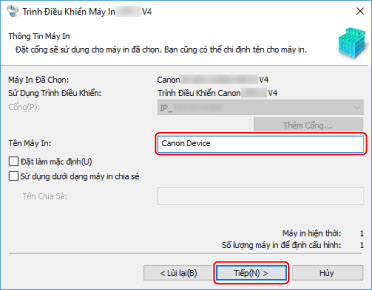 Nếu bạn muốn thay đổi tên thiết bị, hoặc cài đặt như làm thiết bị mặc định, chọn [Định cấu hình thông tin máy in] → nhấp vào [Tiếp].