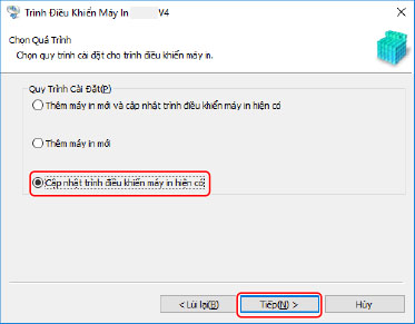 Chọn [Cập nhật trình điều khiển máy in hiện có] → nhấp vào [Tiếp].