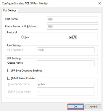 Ở đây, phương pháp tạo một cổng Raw hoặc LPR bằng "Standard TCP/IP Port" được giải thích.