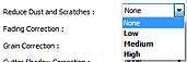 Iestatiet funkciju Samazināt putekļus un skrāpējumus (Reduce Dust and Scratches) kā Zems (Low), Vidējs (Medium) vai Augsts (High) atbilstoši putekļu un skrāpējumu pakāpei.