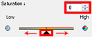 (slīdni) zem Piesātinājums (Saturation) pa kreisi, lai samazinātu piesātinājumu (aptumšotu attēlu), un pa labi, lai palielinātu piesātinājumu (padarītu attēlu spilgtāku). Varat arī ievadīt vērtību (no -127 līdz 127).