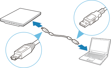 Connectez l'extrémité la plus large (Type-A) du câble USB à l'ordinateur, puis l'extrémité la plus petite (Mini-B) au scanner.