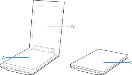 Za pomocą miękkiej, suchej ściereczki przetrzyj delikatnie płytę szklaną (A), wewnętrzną część pokrywy dokumentów (biała powierzchnia) (B) oraz zewnętrzne części obudowy (C). Uporczywe zabrudzenia należy czyścić za pomocą dobrze wyżętej, wilgotnej ściereczki, a następnie usunąć wilgoć miękką, suchą ściereczką. Należy starannie ścierać wszystkie powierzchnie, zwłaszcza szklane, aby nie zostawiać na nich resztek brudu.