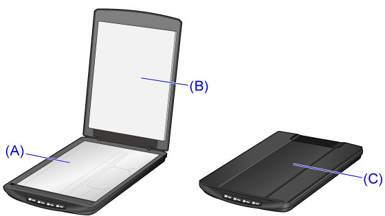 Törölje le az üveglapot (A), a dokumentumfedél belső oldalát (a fehér lapot) (B) és a külső felületet (C) egy puha, száraz ruhával. A makacs szennyeződéseket jól kicsavart nedves ruhával távolítsa el, majd a nedvességet puha, száraz ruhával törölje le. Alaposan törölje át, hogy különösen az üvegfelületen ne maradjon semmi szösz.