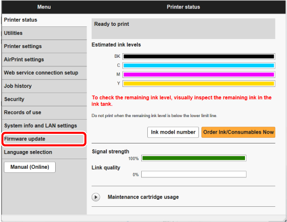 If new firmware is released, it will be displayed in Remote UI. Depending on the printer, it may appear on the HOME screen. New firmware releases sometimes include improvements to security functionality, so always be sure to update firmware to the latest version. Run from the operation panel or Remote UI.