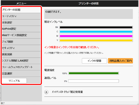 - クリーニングなど、プリンターのメンテナンスを実行できます。