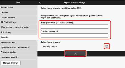 - Паролата е необходима при импортиране на експортираните настройки. Използвайте буквено-цифрени знаци с половин ширина.
