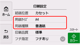 用紙サイズと用紙種類を、カセットの用紙に合わせる