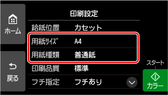 用紙サイズと用紙種類を、カセットの用紙に合わせる
