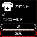 ボタンで[変更]を選び、OKボタンを押したあと、カセットにセットした用紙の用紙サイズと用紙種類を正しく登録してください。