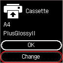 na tiskalniku izberite Spremeni (Change) in pritisnite gumb OK, nato pravilno registrirajte informacije o papirju (velikost papirja in vrsta medija) za papir, naložen v kaseto, v tiskalnik.
