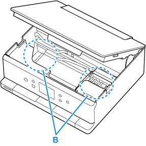 - プリンター内部の左側/右側の空間(B)に紙片が残っていないか
