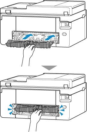 后盖右侧的凸起部分插入打印机,然后推入后盖的左侧直到其完全关闭。