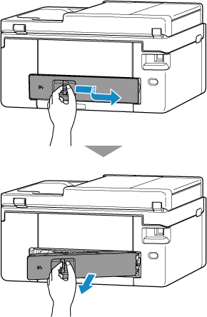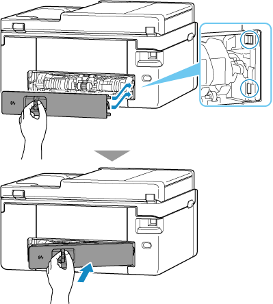 Vstavite izbokline na desni strani zadnjega pokrova v tiskalnik, nato potisnite levo stran zadnjega pokrova, da se popolnoma zapre.