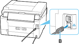 Collegare la stampante e un dispositivo di rete (router, ecc.) con un cavo Ethernet (B).