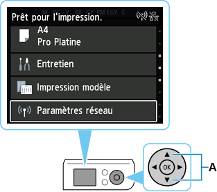 1. Utilisez la touche Haut ou Bas (A) pour sélectionner Paramètres réseau et appuyez sur le bouton OK.