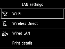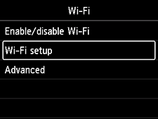 Pritisnite gumb DOMOV (HOME), izberite Nastavitve LAN (LAN settings) > Wi-Fi > Nastavitve (Settings) > Nastavitev Wi-Fi (Wi-Fi setup) in pritisnite gumb OK.