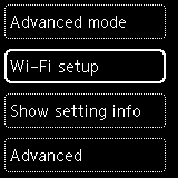 Selectaţi Configurare din ecranul ACASĂ, apăsaţi pe butonul OK, selectaţi Setări LAN (LAN settings) > Wi-Fi > Configurare Wi-Fi (Wi-Fi setup), apoi apăsaţi pe butonul OK.